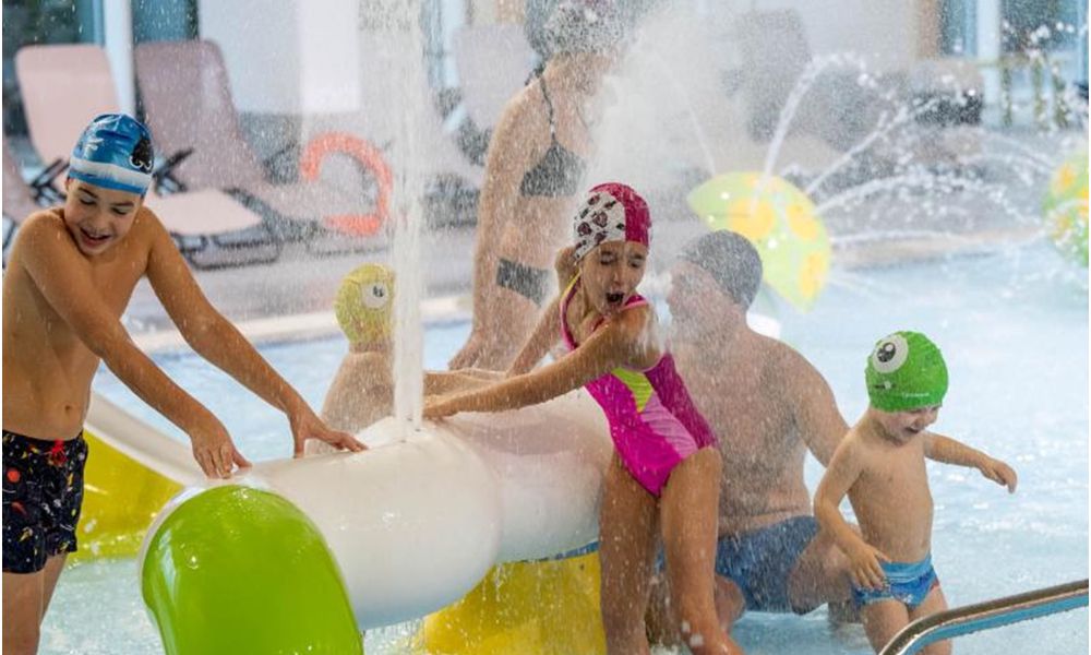 - Un Acquapark con 2 vasche coperte riscaldate attrezzate con scivoli, giochi in acqua, corsie nuoto, getti d’acqua e una vasca idromassaggio esterna e riscaldata,
